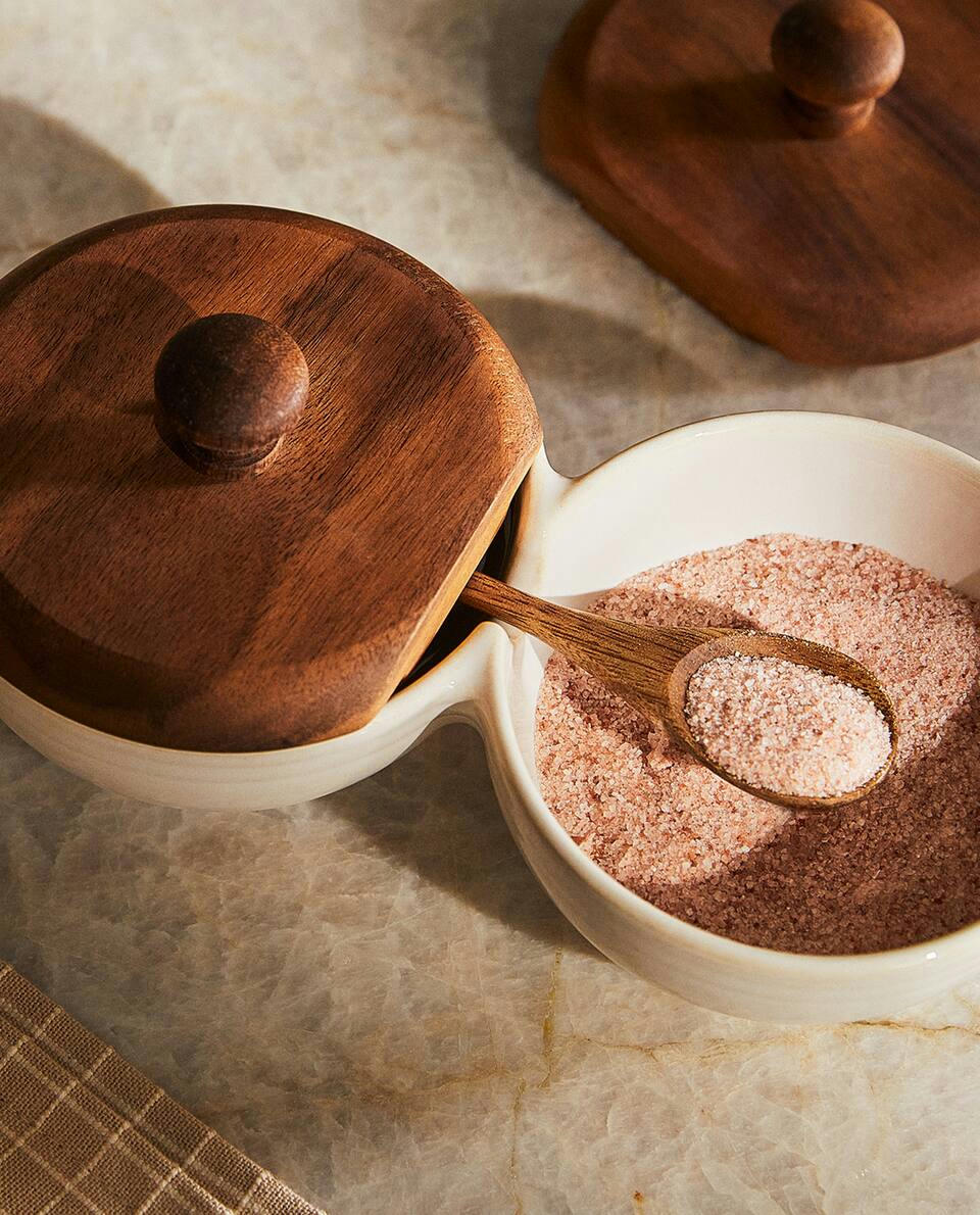 BOROSILICATE GLASS AND WOODEN SUGAR BOWL